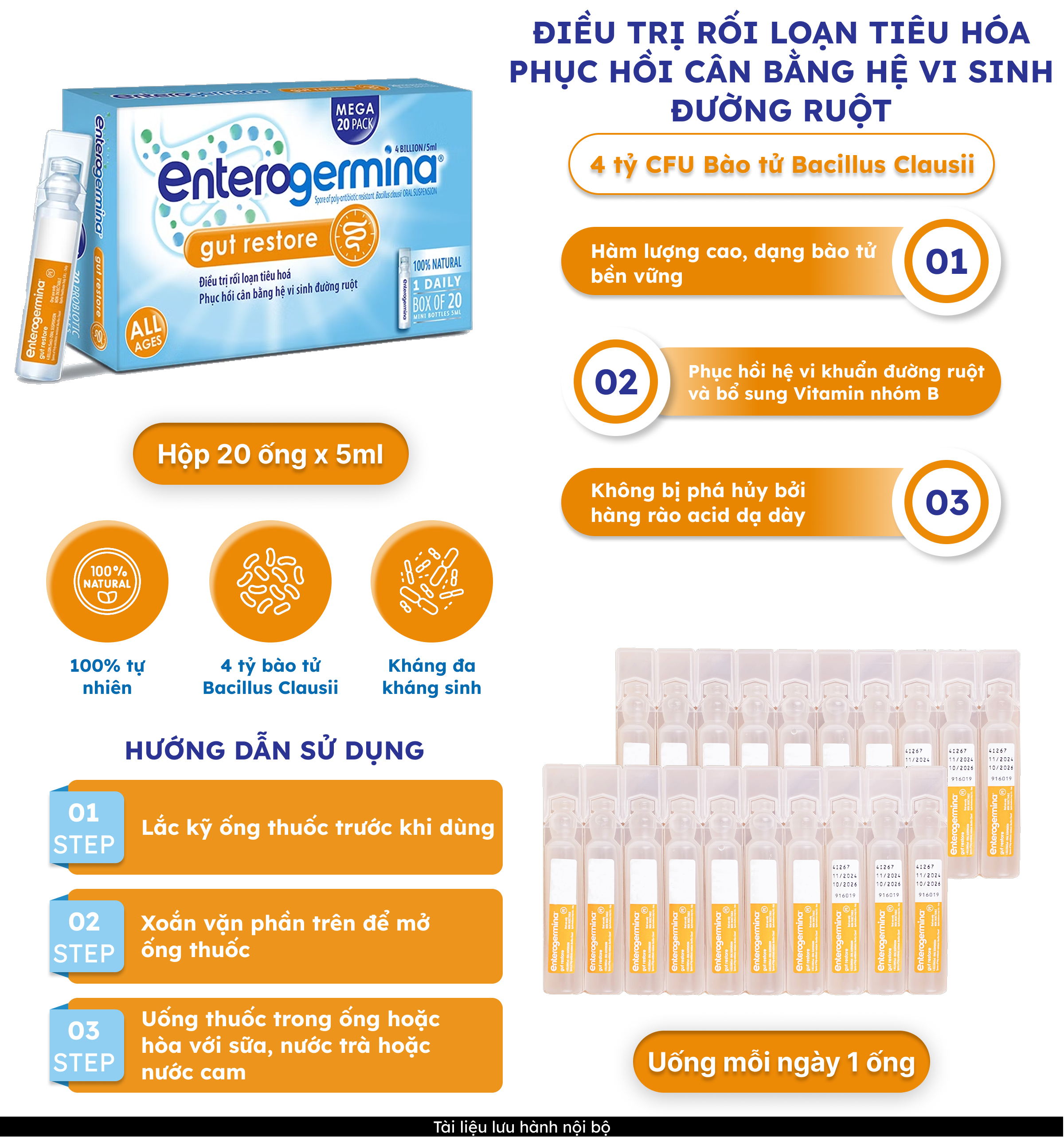 Enterogermina 4 billion/5ml là sản phẩm của Sanofi (Pháp), thành phần chính bào tử Bacillus clausii kháng đa kháng sinh có công dụng điều trị và phòng ngừa rối loạn hệ vi khuẩn đường ruột và bệnh lý kém hấp thu vitamin nội sinh. Điều trị hỗ trợ để phục hồi hệ vi khuẩn đường ruột bị ảnh hưởng khi dùng thuốc kháng sinh hoặc hoá trị liệu. Rối loạn tiêu hoá cấp và mạn tính ở trẻ em do nhiễm độc hoặc rối loạn vi khuẩn đường ruột và kém hấp thu vitamin.