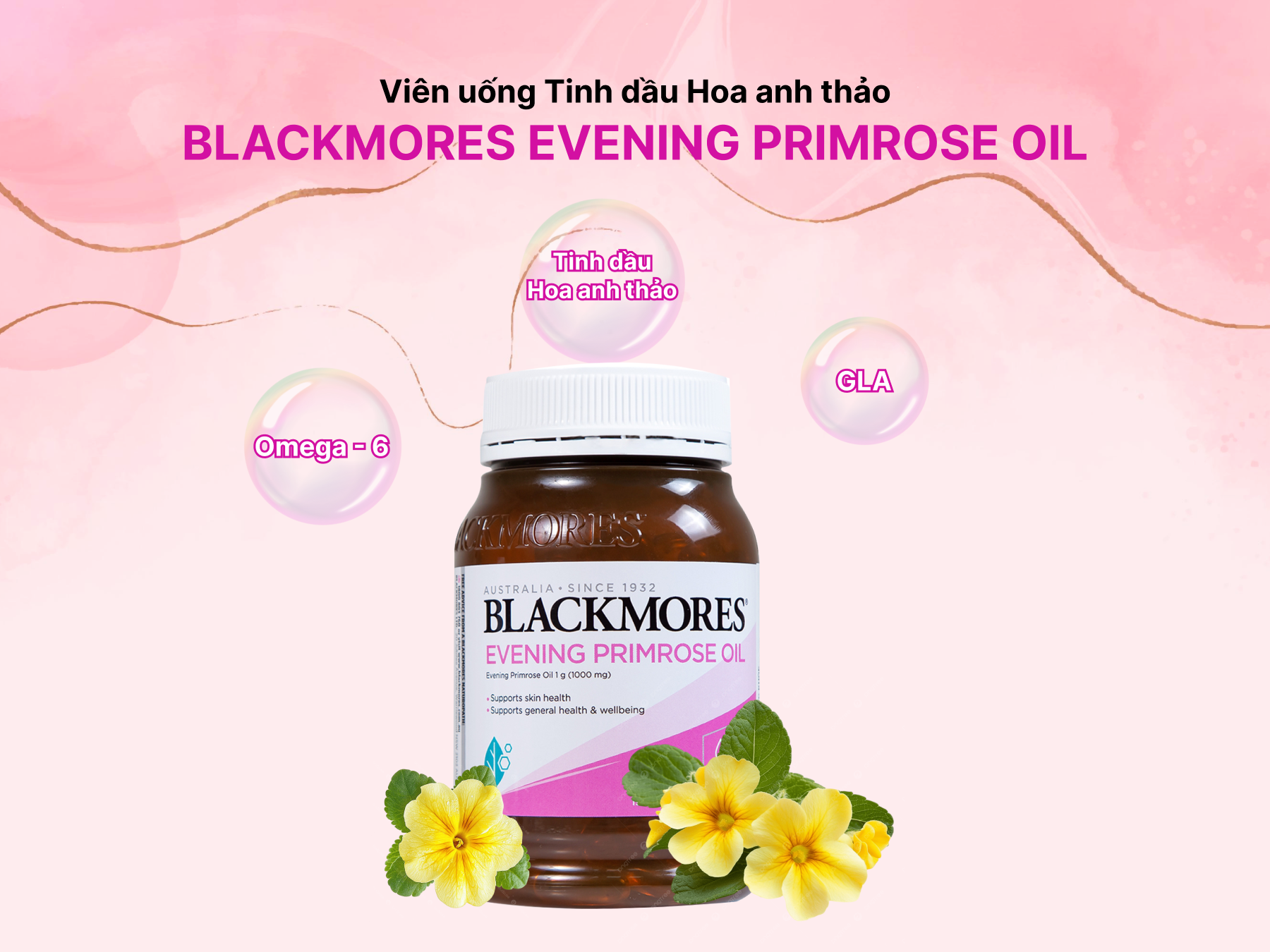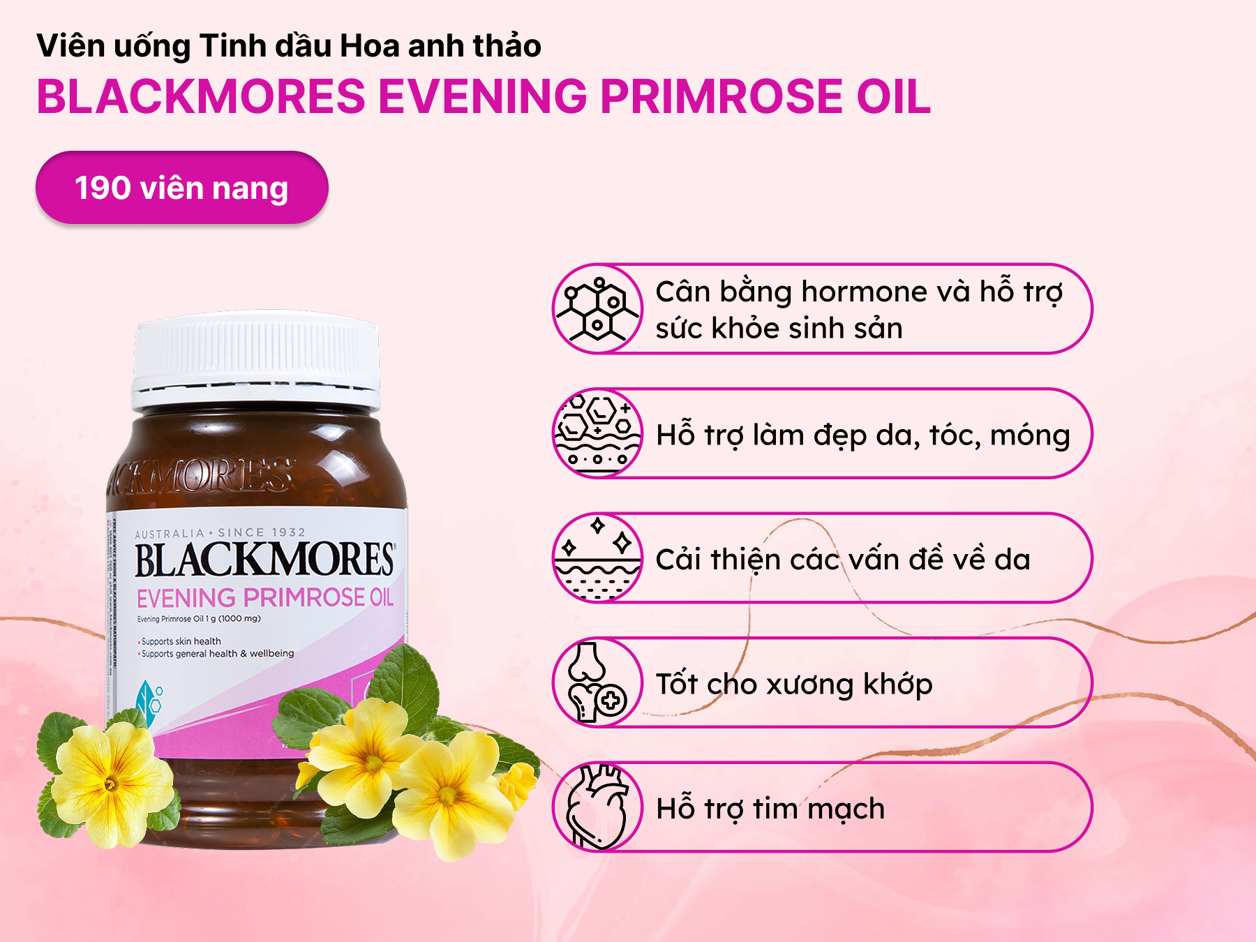 Viên uống tinh dầu hoa anh thảo Blackmores Evening Primrose Oil hỗ trợ làn da, tóc, móng, hệ tim mạch và xương khớp