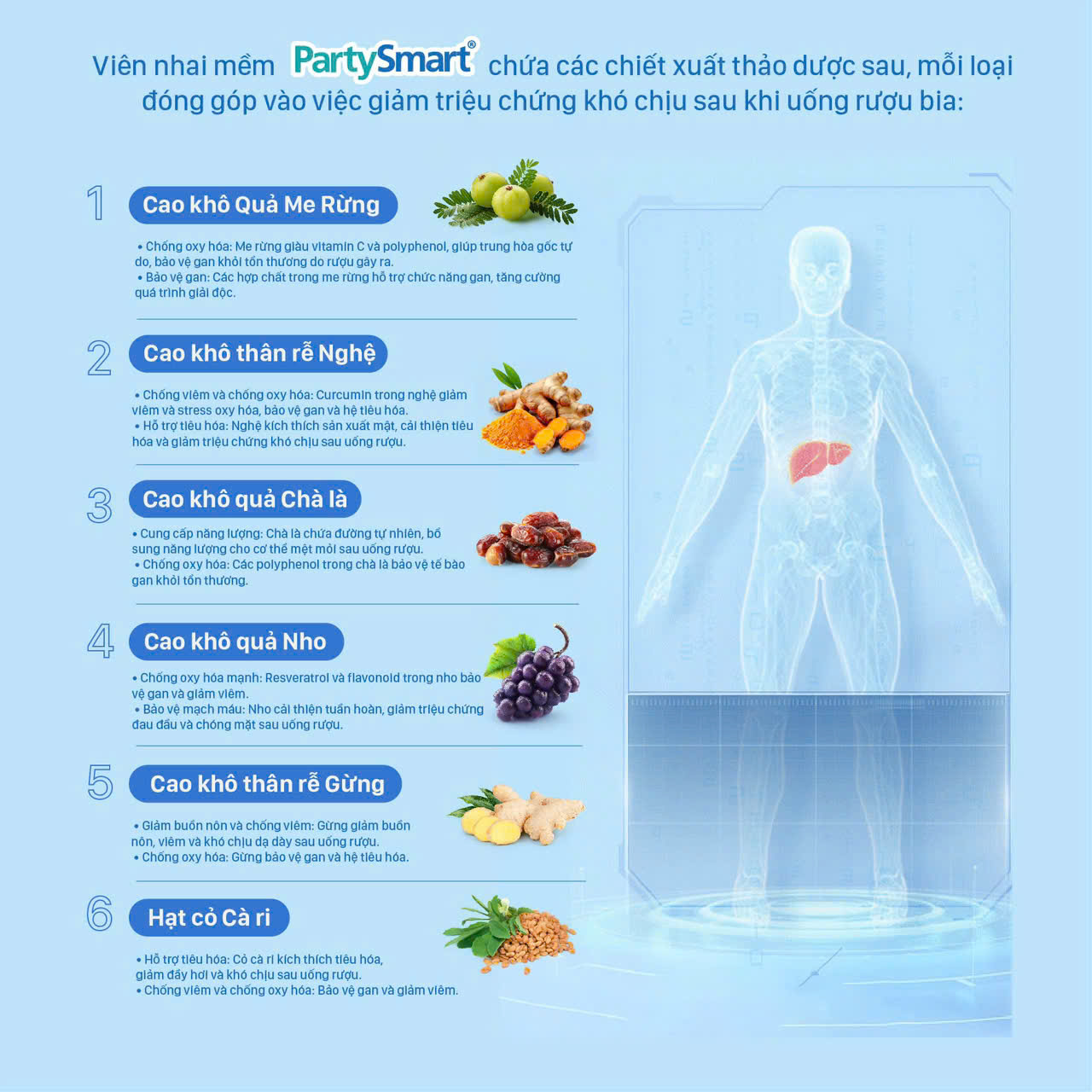 PartySmart có công thức thảo dược giúp ngăn ngừa tình trạng nôn nao. Sản phẩm đã được chứng minh lâm sàng là an toàn và hiệu quả. Làm giảm các triệu chứng như: