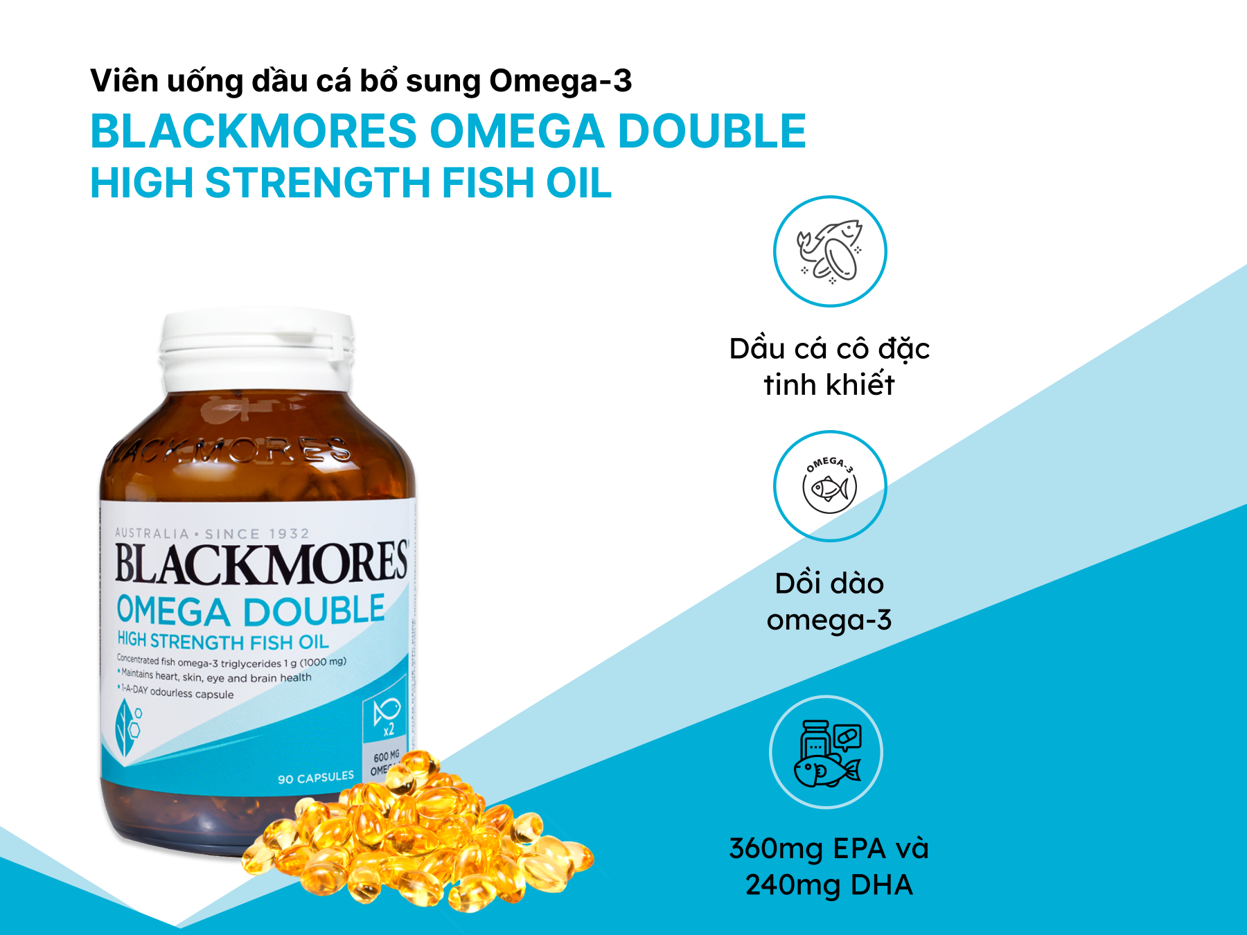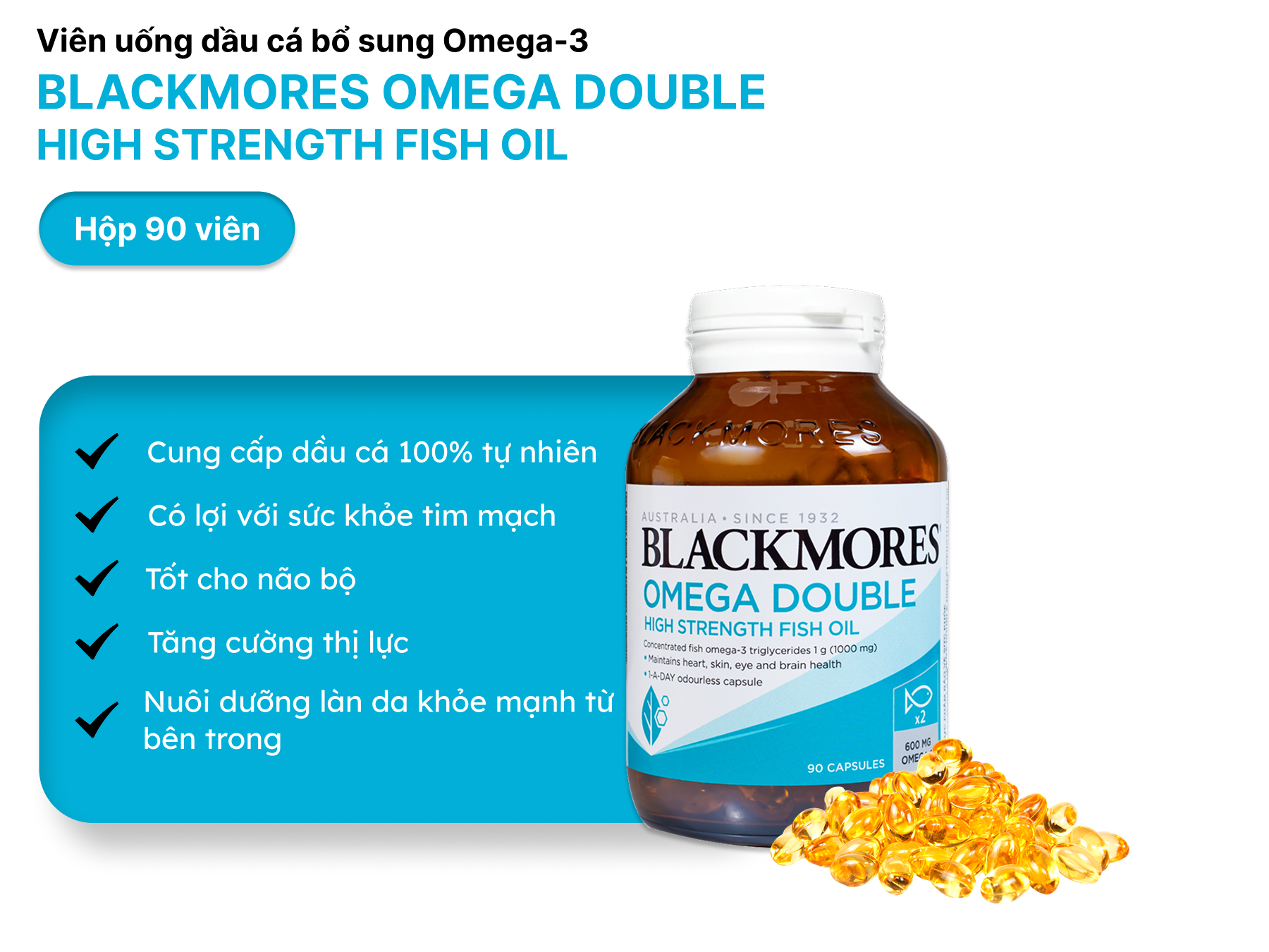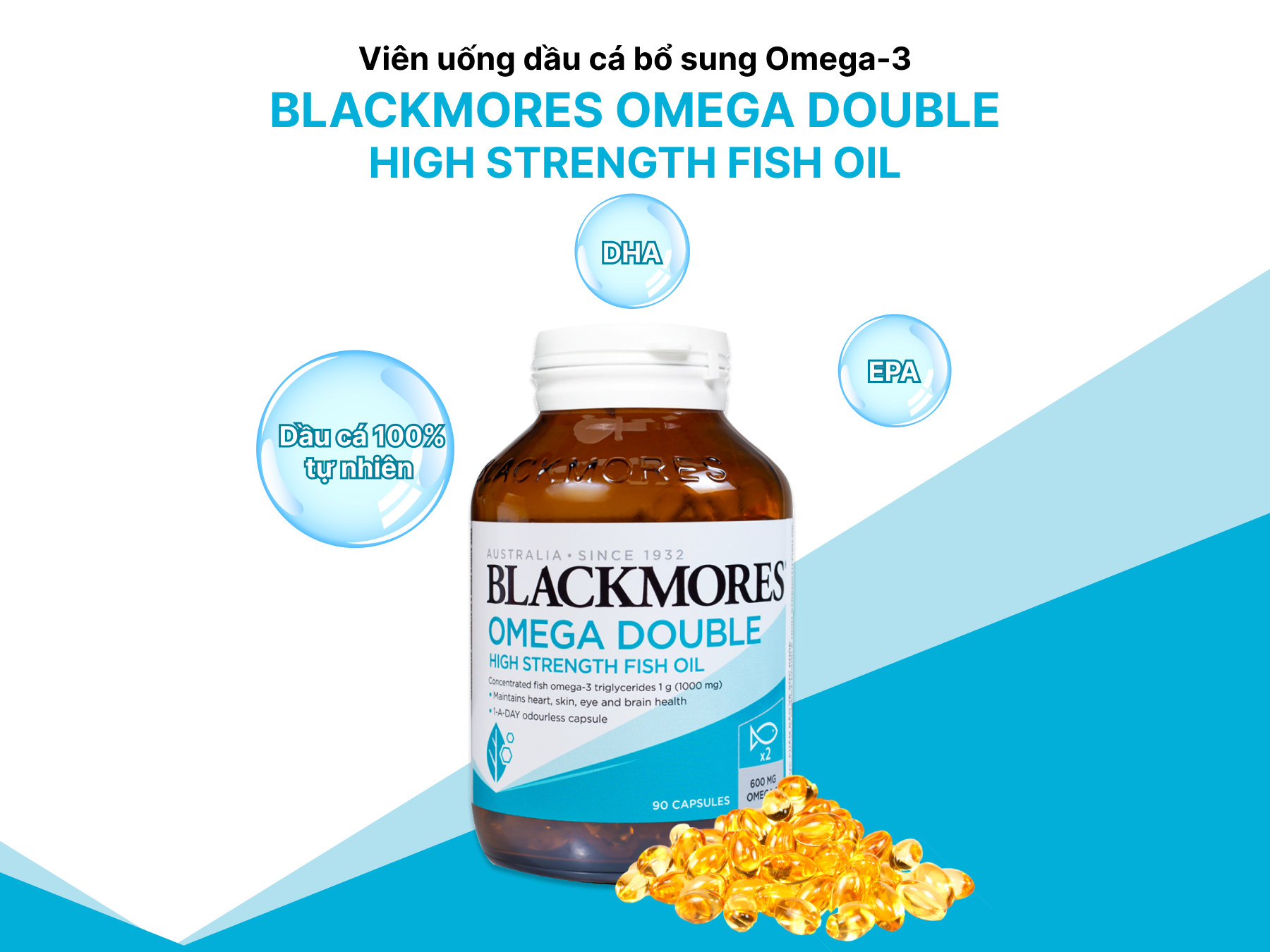 Blackmores Omega Double High Strength Fish Oil là giải pháp tối ưu giúp bổ sung omega-3, hỗ trợ sức khỏe tim mạch, não bộ, thị lực và làn da.