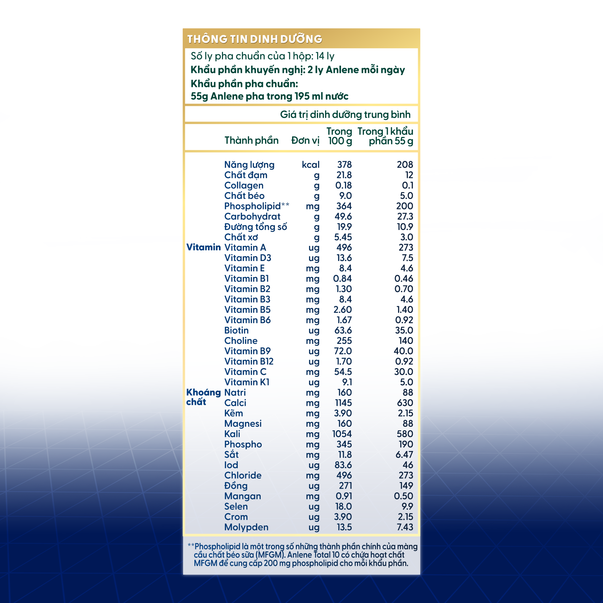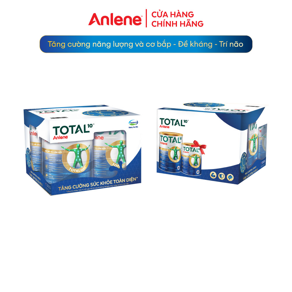 Đặc điểm nổi bật: Anlene Total 10 mới với công thức TOTAL MAX được điều chế đặc biệt. Với 27 Vitamin và khoáng chất và chứa Lactose thấp, giúp bổ sung hệ dưỡng chất cho vận động, đề kháng, não, tiêu hóa bao gồm: Đạm, Canxi, Collagen và Vitamin C, Vitamin B, Hợp chấy MFGM, Vitamin A, Kẽm, Magiê, Biotin, Prebiotic,